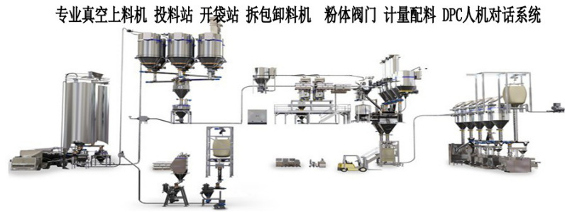 本公司提供的粉體配料系統(tǒng)是運(yùn)用粉體輸送儲、存設(shè)備和各種計(jì)量傳感器,對一種或多種粉體物料按量輸送、配比混合及輸送投料的設(shè)備系統(tǒng)。是在精細(xì)化工、化學(xué)、油漆、油脂、藥品、飼料、日用化工、食品、制藥等行業(yè)生產(chǎn)過程中常用集成設(shè)備,通常是由DCS控制相關(guān)設(shè)備模塊,如:拆包站、輸送管路、儲存艙、計(jì)量倉等組成的自動化配料設(shè)備系統(tǒng)。例如:反應(yīng)釜的粉體投料控制、滑石粉、樹脂、飼料等粉體成品包裝配比。