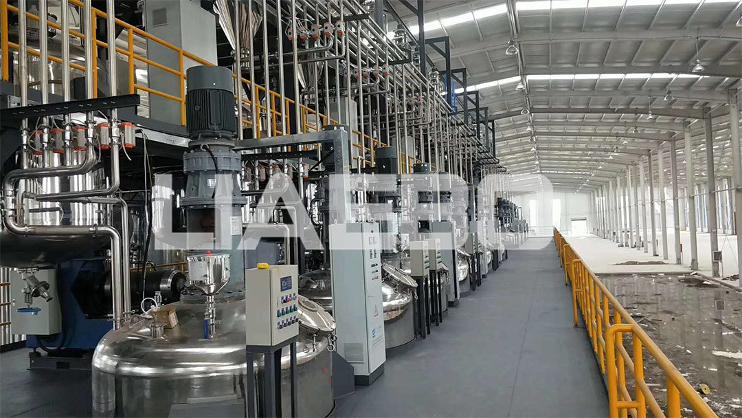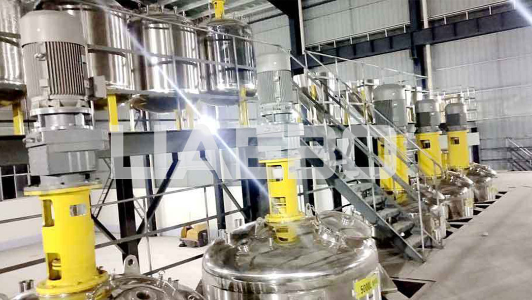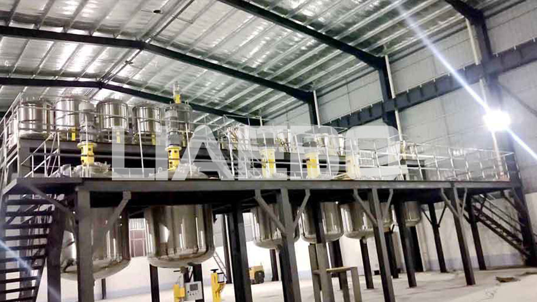 三樓溶解乳化釜、二層成品平臺、一層儲罐+自動包裝。