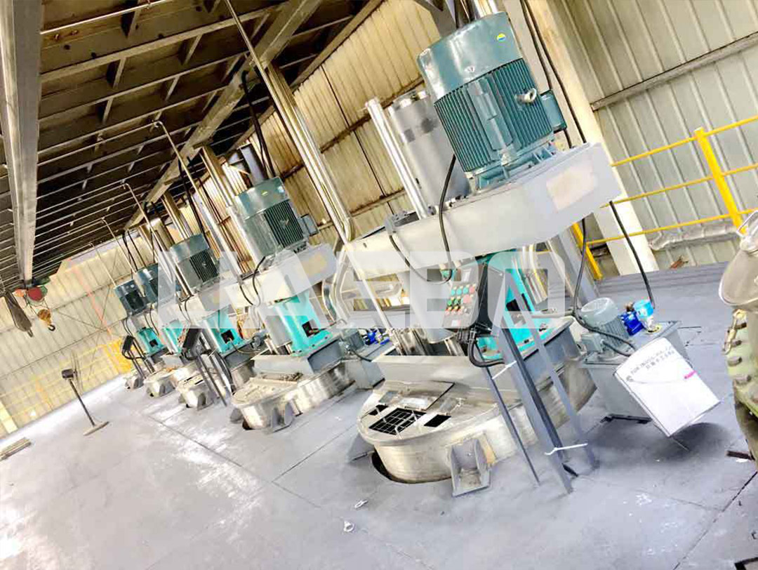 立體布置,三層投料,二層生產(chǎn)平臺(tái),一層研磨、包裝。