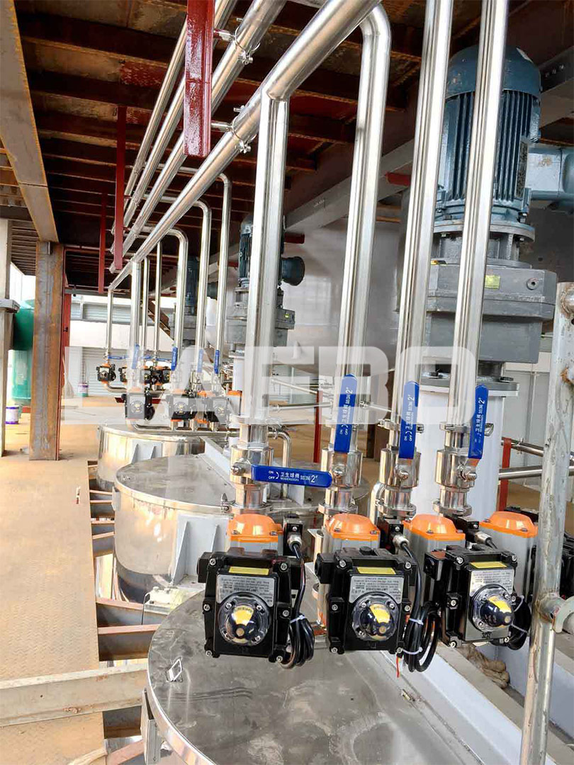 水性乙烯基高防腐涂料生產(chǎn)線(xiàn),年產(chǎn)2萬(wàn)噸成品,專(zhuān)業(yè)電廠(chǎng)防腐涂料,工藝要求高,生產(chǎn)過(guò)程對(duì)溫度、分散力度都有特別的要求,設(shè)備設(shè)計(jì)附加分散盤(pán)釜內(nèi)升降,滿(mǎn)足不同層面固液混合需求,解決分散不均衡的問(wèn)題。自動(dòng)配料、粉體隔層投放、釜蓋密封設(shè)計(jì),解決了配料、品質(zhì)、環(huán)保、安全等一系列重要問(wèn)題。