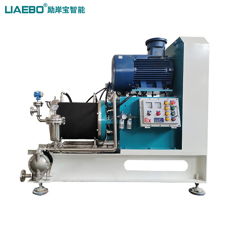 經(jīng)預(yù)處理的液-固物料泵送入裝有高耐磨研磨珠介質(zhì)的磨筒內(nèi),由高速旋轉(zhuǎn)的圓盤式不銹鋼葉片帶動,研磨珠對物料產(chǎn)生強(qiáng)烈剪切、碰撞、擠壓作用,分散盤對聚集體再次分散,迅速達(dá)到細(xì)化顆粒的效果,由動態(tài)