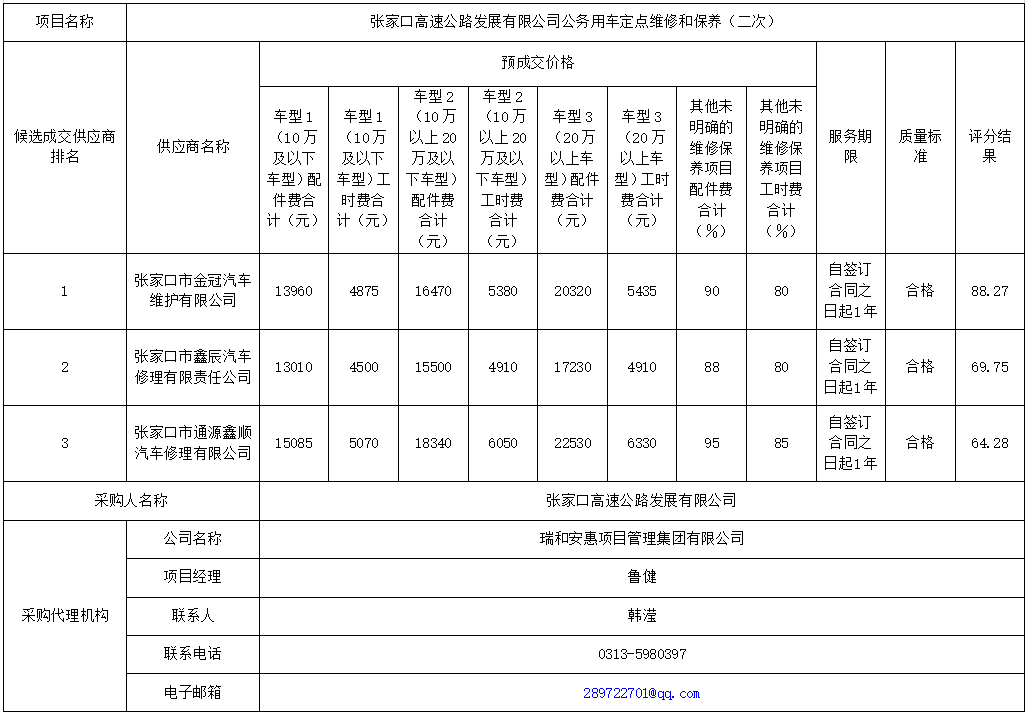 張家口高速公路發(fā)展有限公司公務(wù)用車定點(diǎn)維修和保養(yǎng)(二次)候選成交供應(yīng)商公示